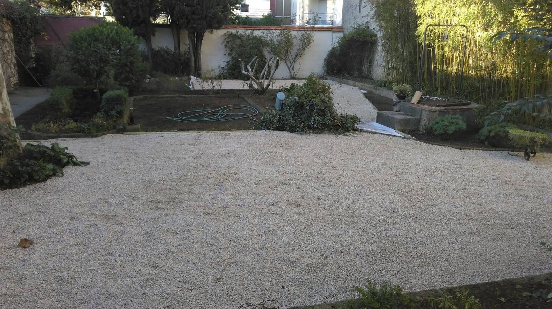Suite à la suppression et le remplacement des végétaux, un espace pelouse a été créé ainsi qu'un cheminement en gravier posé sur géotextile (pour éviter la propagation des mauvaises herbes et stabiliser le sol).
