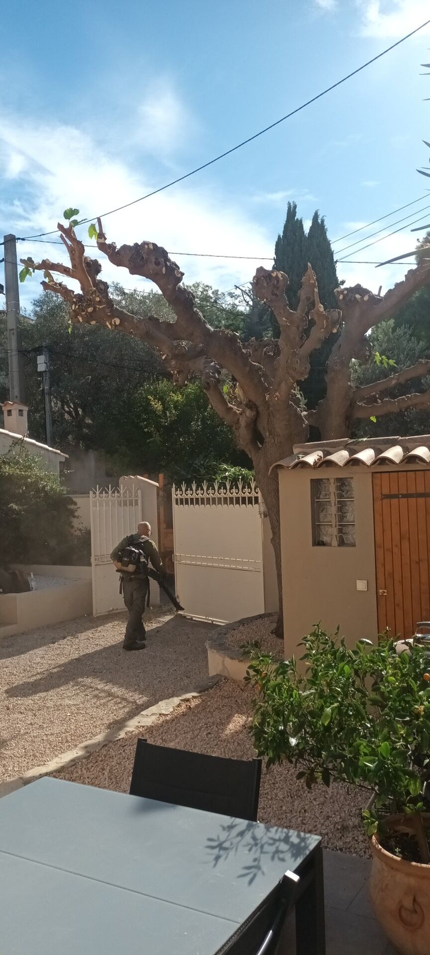 Cet arbre est élaguer de la même manière depuis environ 10 ans, ce qui lui permet de se revitaliser d année en année ,car c'est un vieux sujet. Cette taille sévère est bonne pour sa longévité. L entreprise jardin forêt de Provence à effectuée se.travail mi octobre pour avoir une bonne descente de sève lors de l'élagage et ainsi une meilleure cicatrisation.