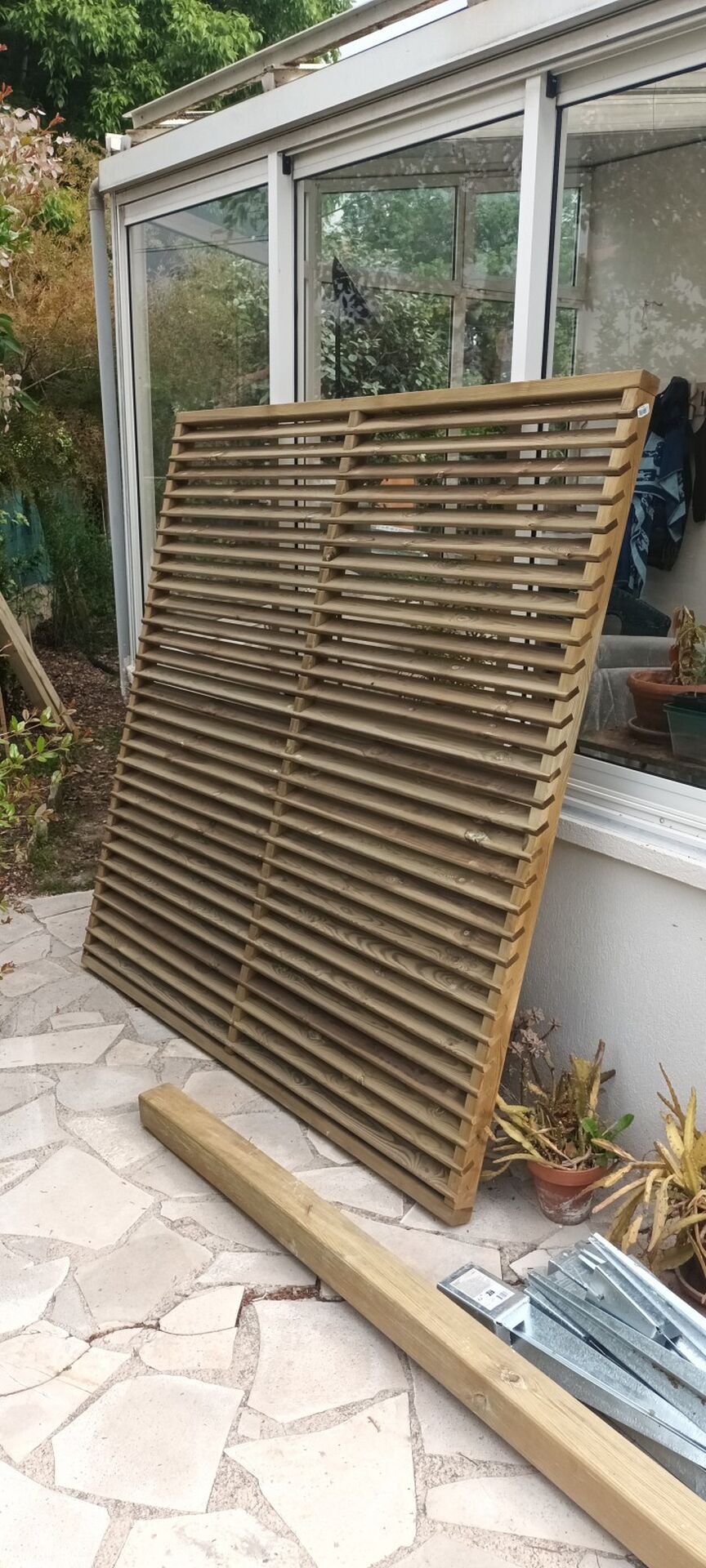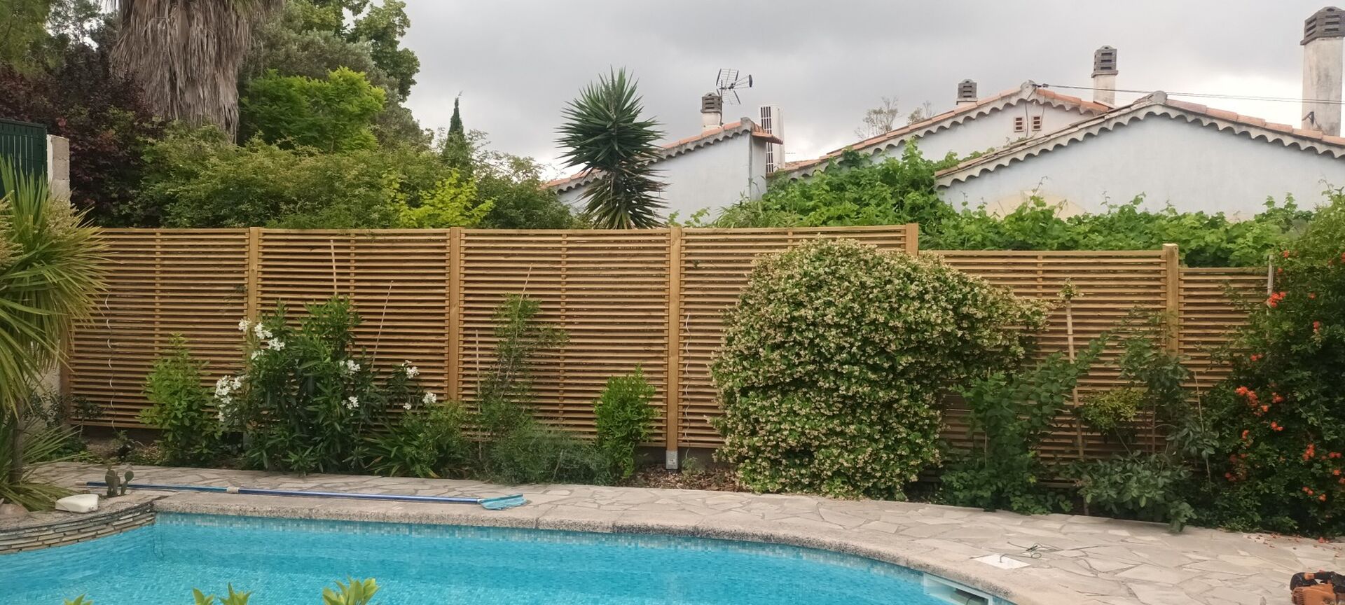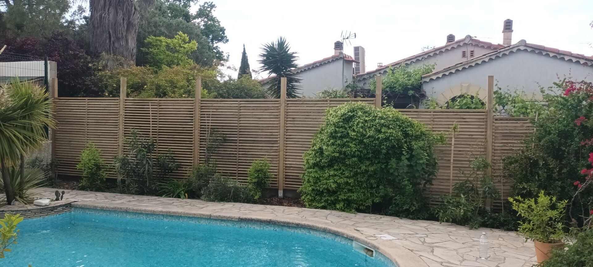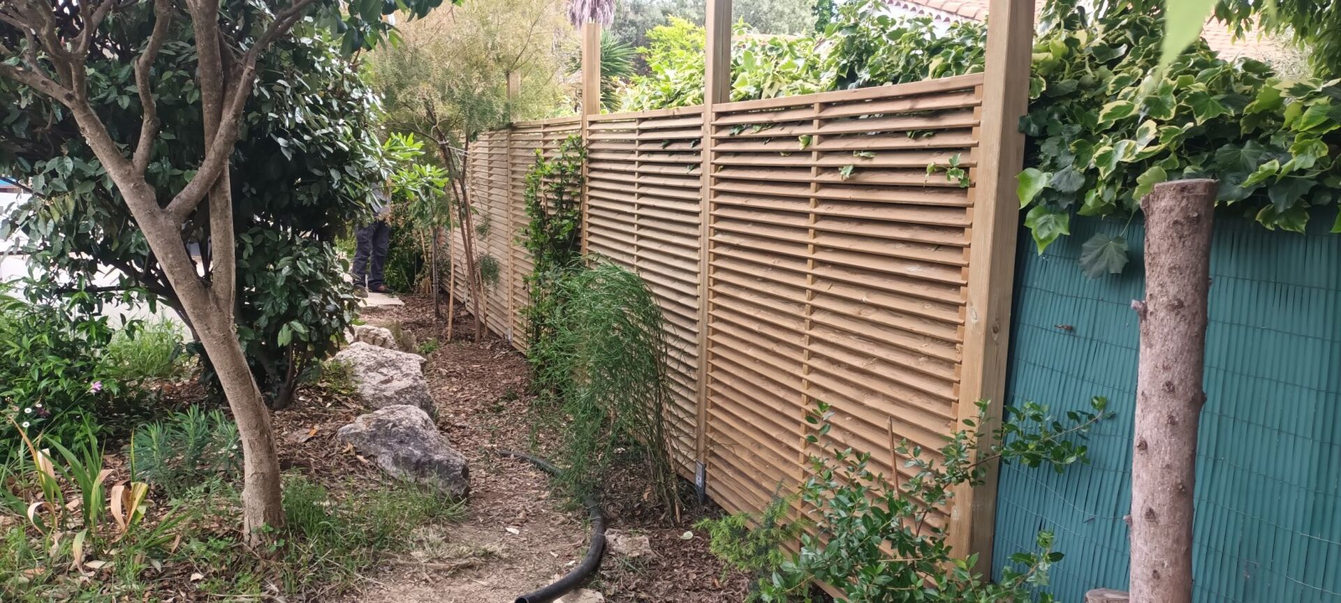 Pose de panneaux en bois style persiennes qui par leurs lames inclinées favorise le passage du vent. Jardin.foret de provence a réaliser ce chantier sur Marseille dans le 14ème arrondissement.